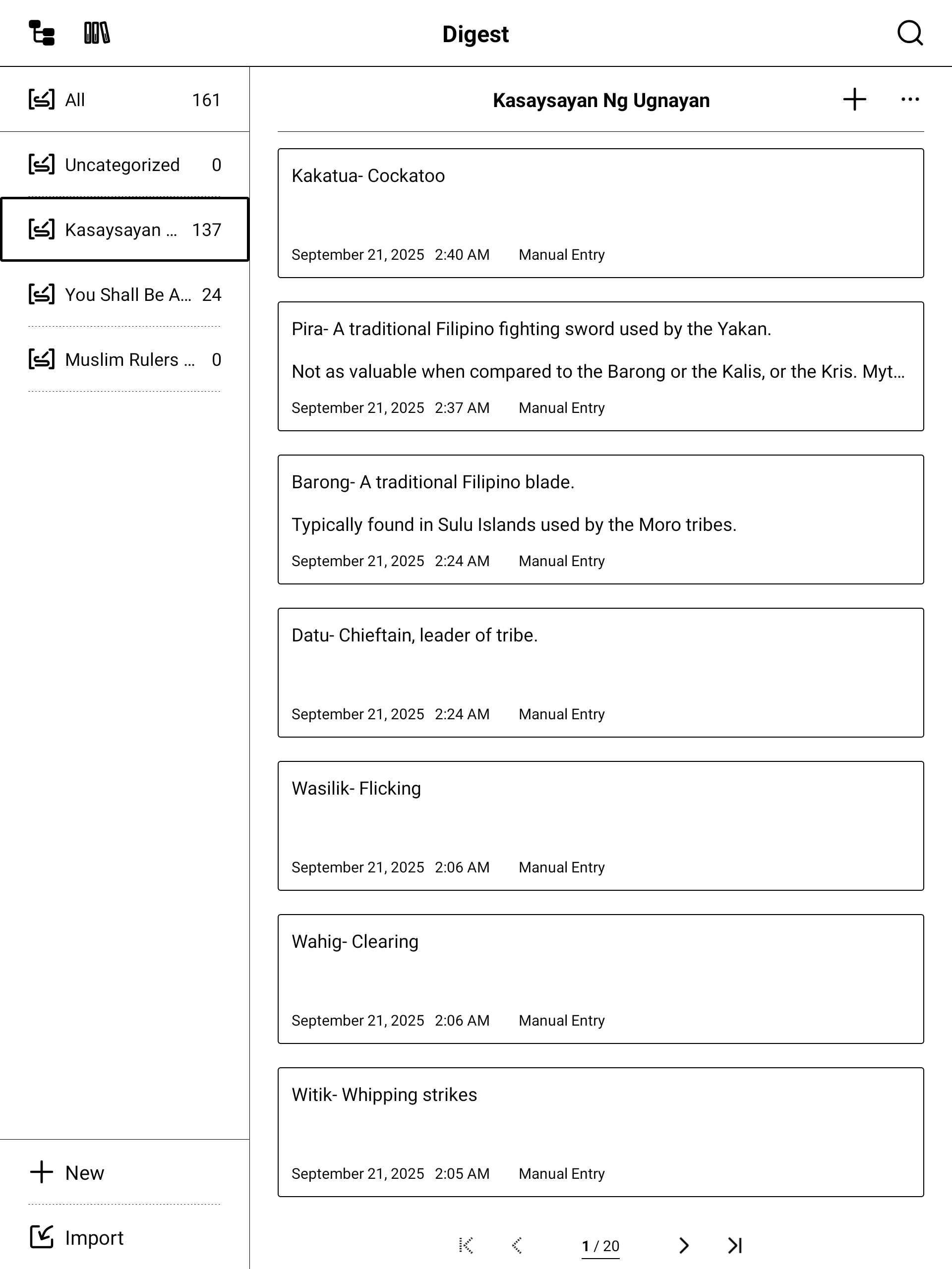 Clippings from Kindle or online sources, pasted into the Digest App through the Partner App.